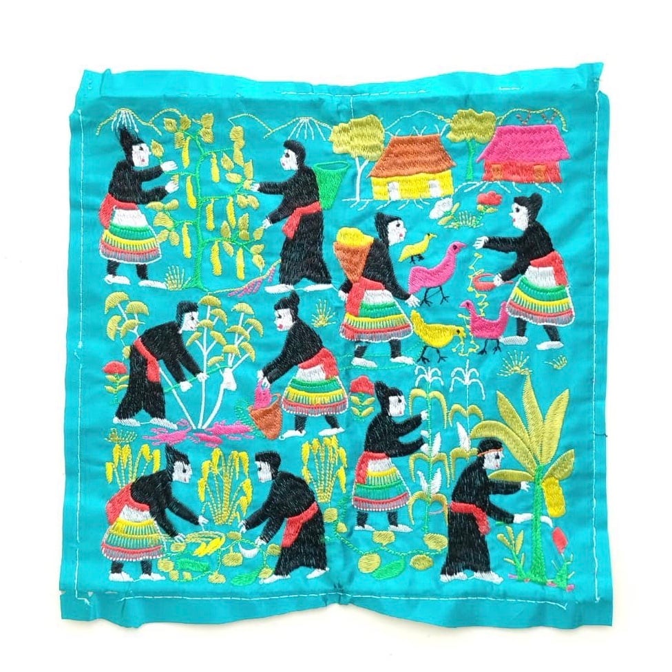ラオス刺繍 森の暮らし 人々と動物たち B ブルー 刺繍生地 約23×23 cm
