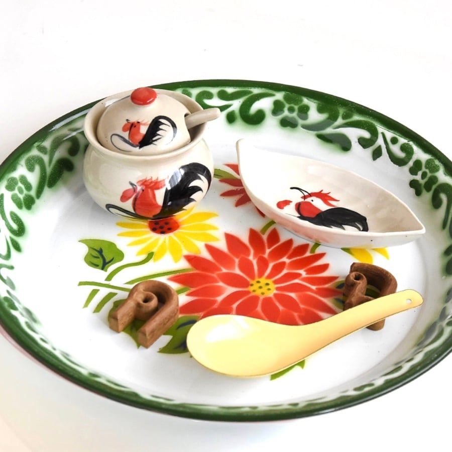 タイ RABBIT BRAND ホーロー皿 30cm 花柄 緑のふち付き