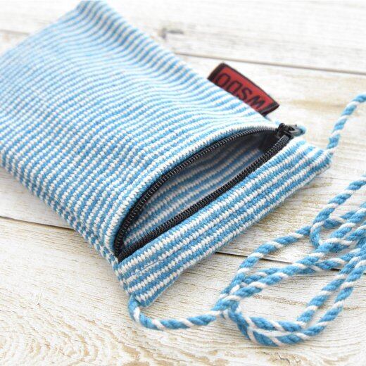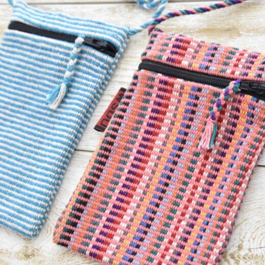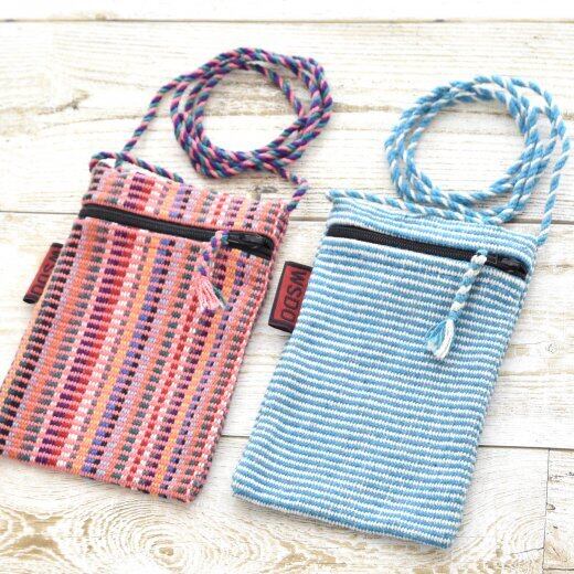 パステルカラーがかわいいハンドメイドのスマホポーチ。