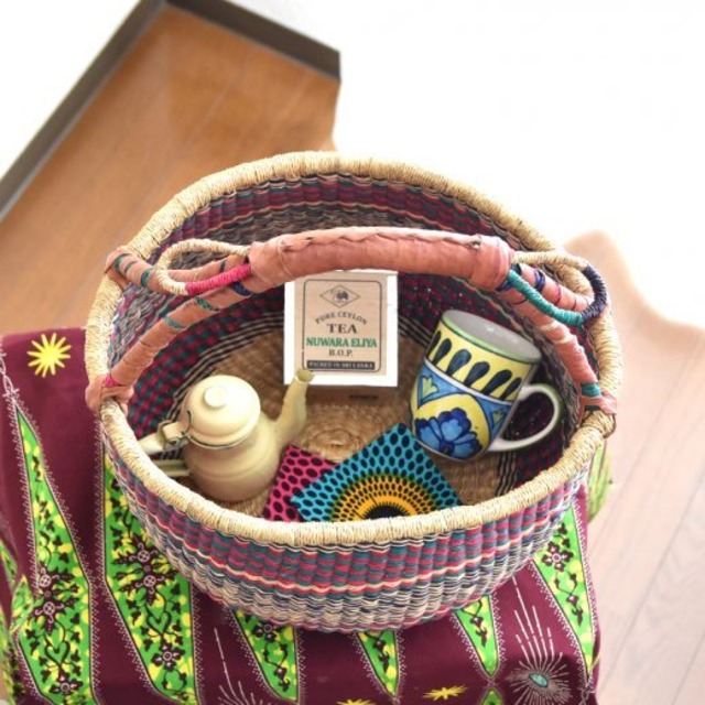 西アフリカのブルキナファソで作られたボーダー柄のカラフルな色合いとキュートなフォルムで人気のバスケット。