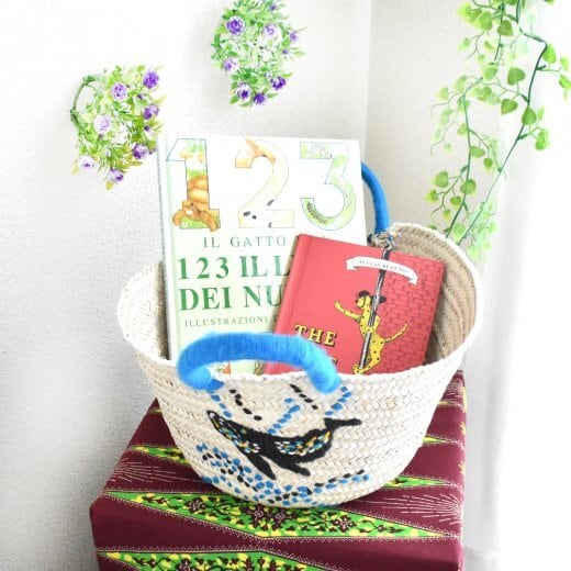 クジラの刺繍がかわいい天然素材のバスケット。
