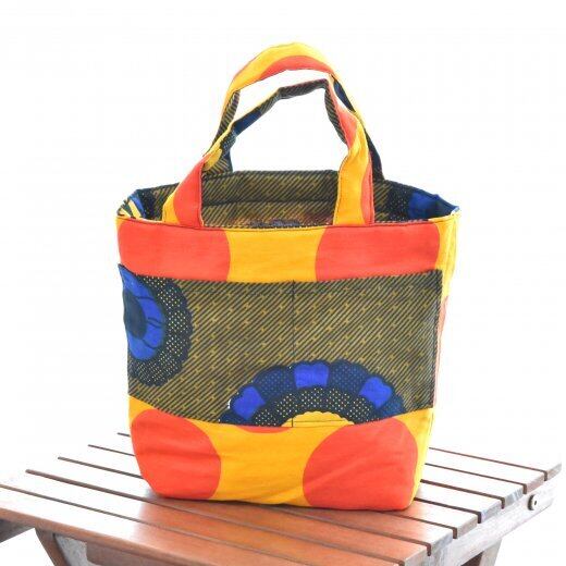 東アフリカのカラフルなプリント布・キテンゲと丈夫なデニムで仕立てたリバーシブルランチバッグ。