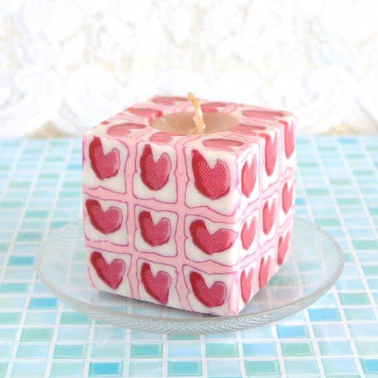 キュートなハート柄のキャンドルです。キューブ型で安定感がよく、テーブルを飾るのに最適なサイズ。キャンドルの炎に映し出された美しい模様が雰囲気のある空間を演出します。