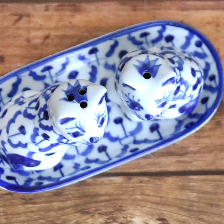 タイ 青白陶器 塩胡椒入れセット A ネコ