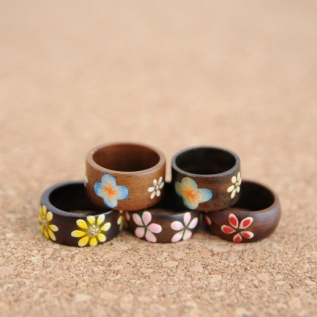 木製の指輪にひとつひとつ手作業で南国らしいペイントを施しています。 とてもキュートで美しい商品です。