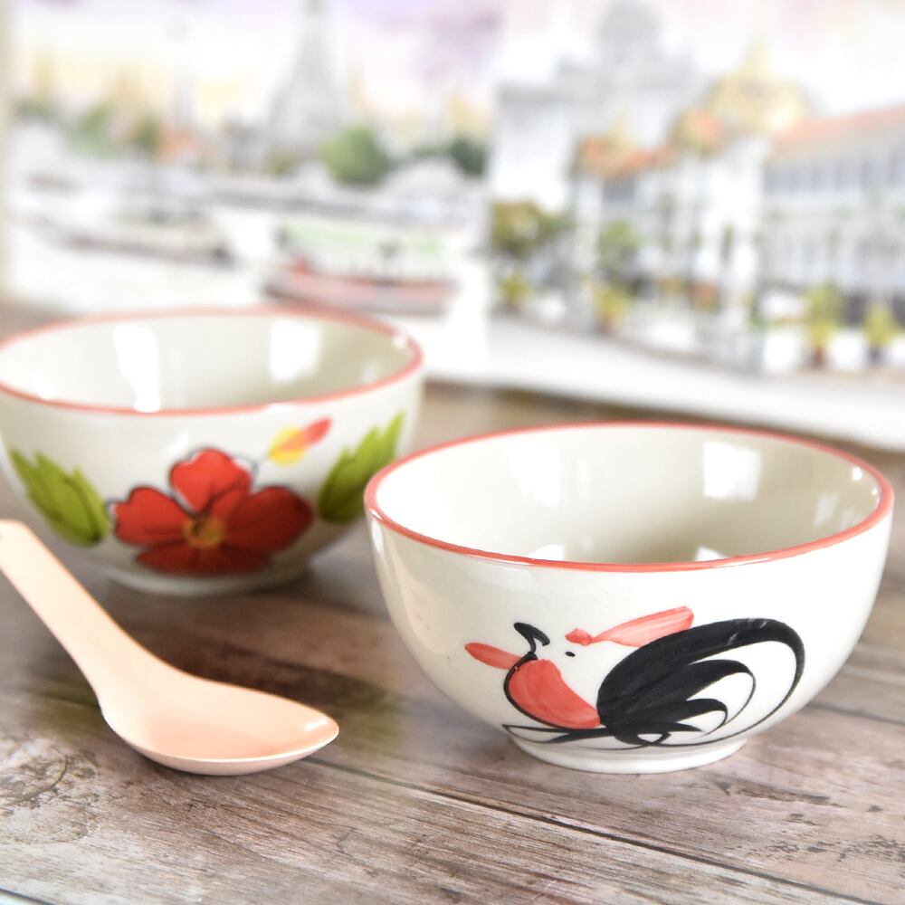タイ ランパーン陶器 ニワトリ柄 ご飯茶碗(ボウル) 11.5cm ②(細い赤のフチ付き)